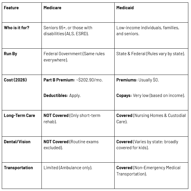 - The "Gap": Medicare rarely covers dental, vision, or long-term custodial care; Medicaid often does.